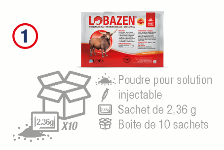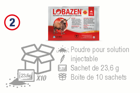 LOBAZEN est un médicament trypanocide appartenant à la famille des diamidines. Il est principalement utilisé pour le traitement curatif des trypanosomoses chez les animaux d’élevage (bovins, ovins, caprins). Il est également utilisé contre la babésiose et la theilériose. Il ne s’utilise pas en prévention, mais en curatif lorsque l’animal présente des signes cliniques de la maladie.